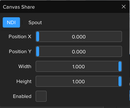 Canvas Share pop-up with tabs for NDI and Spout output.