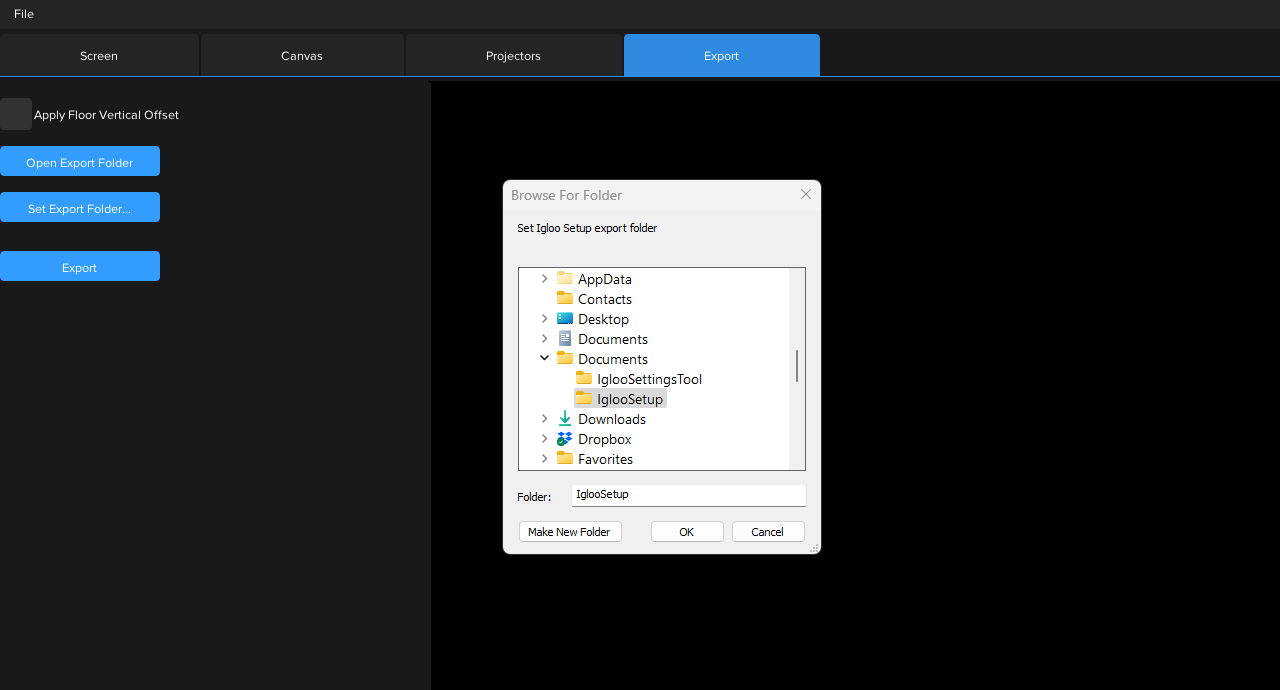 TIP - copy the AppSettings.xml file from C:\ProgramData\Igloo Vision\IglooWarper to the Igloo Setup export folder before clicking the Export button. This will modify the file with the relevant settings and it can then be copied back to its original location.