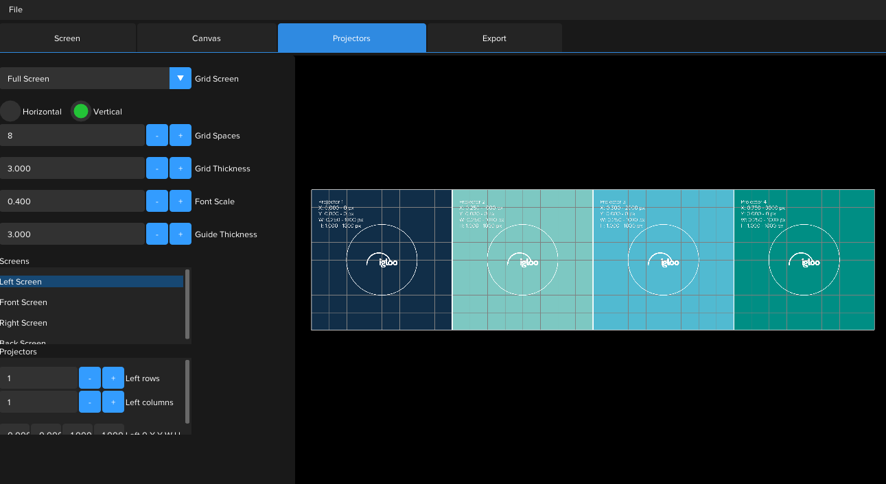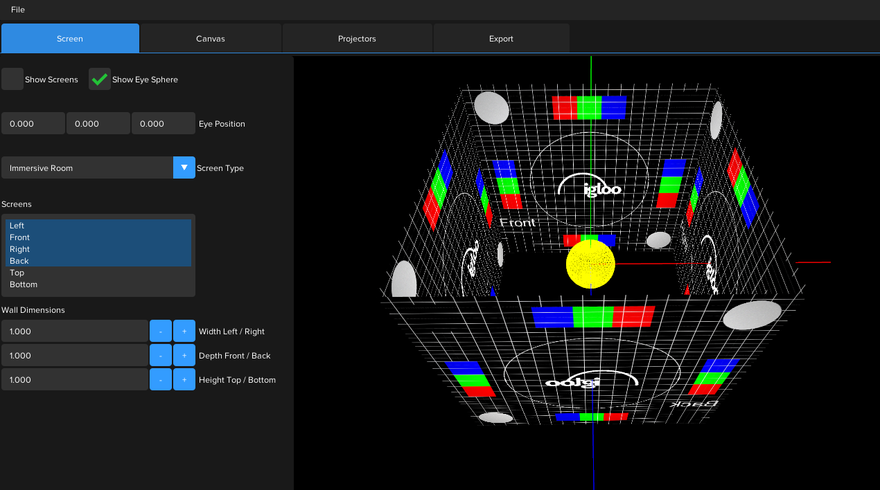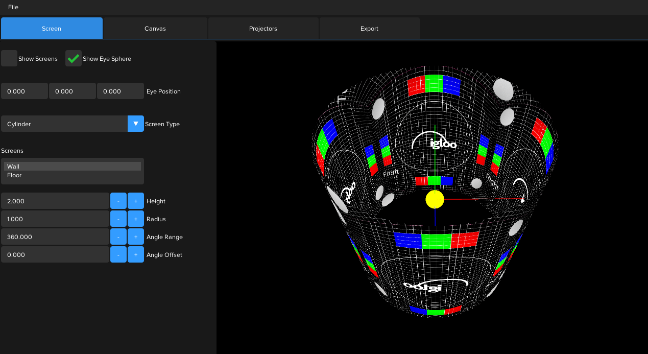 The user interface consists of four tabs - Screen, Canvas, Projectors and Export, which are intended to be used sequentially. These represent the stages in the Igloo Setup modelling pipeline. The workflow begins by defining the geometry of the Screen. The Canvas tab uses the screen dimensions to determine the pixel resolution of the space. Likewise, the Projectors tab uses the canvas to specify the projector regions and other attributes. Finally, the configuration files are generated in the Export tab.