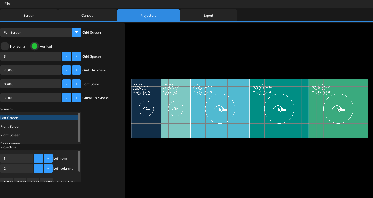 Each Screen can also be edited to modify the number of projectors. To add a second projector to the left screen, for instance, we’d change the number of columns to 2: