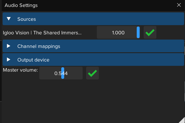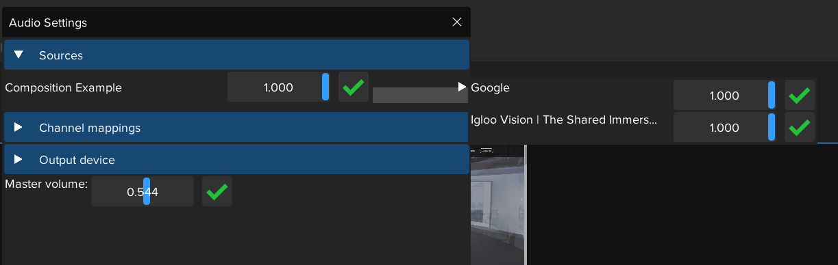 Every audio capable Layer will show within the sources menu, where the volume and mute settings can be configured. These settings are also available within the Playback tab of the Layer.
