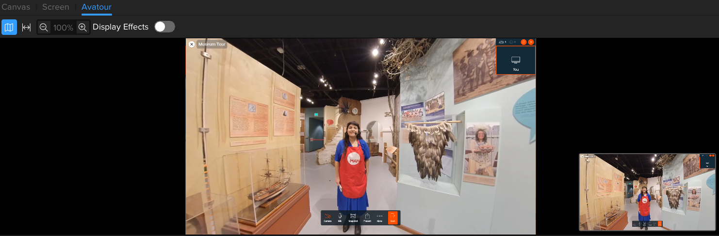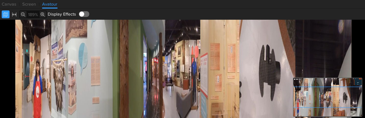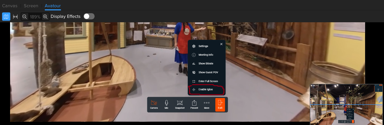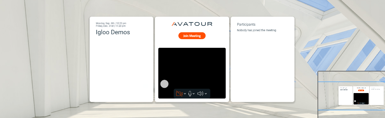 This integration is built by the Avatour development team supported by the Igloo application integration team. The integration enables the 360 video output to be displayed in a suitable format for Igloo immersive spaces. The integration can be activated using a button in the Avatour user interface and it can also be specified with a URL parameter.