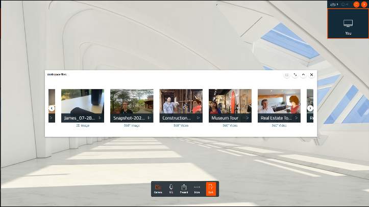 Once in the meeting, select one of the Workspace files e.g. the Museum Tour. This will display as an orbitview style of 360 movie, allowing you to move the camera view by click-dragging the left mouse button over the content.