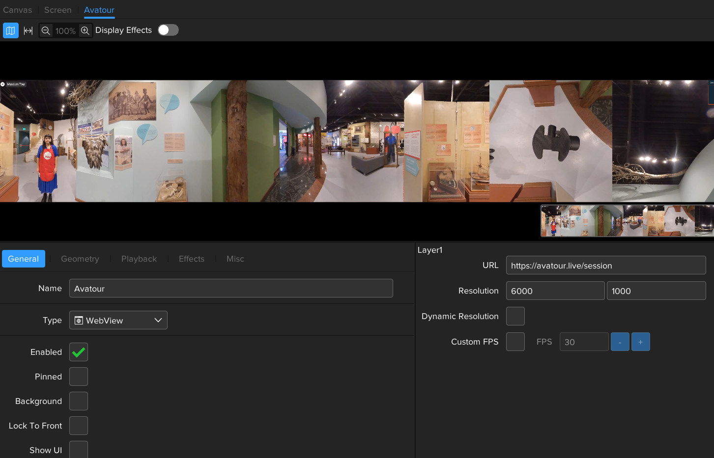Make the following changes to the layer to display the cubemap correctly. Untick the Dynamic Resolution option and set the WebView resolution to be 6000 x 1000. Untick the Show UI option.