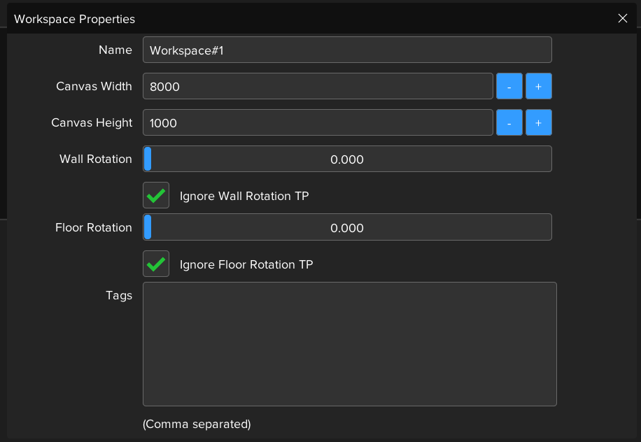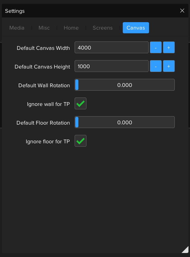 The two checkboxes named "Ignore wall/floor rotation TP" determine how layers using the TruePerspective (TP) effect behave in relation to the canvas rotation. Rotating the canvas output of a true perspective layer can disrupt the true perspective effect. For example, the true perspective effect expects the corners of the room to be in a fixed position, but changing the output rotation can cause the corners calculated by the true perspective shader to be misaligned with the physical corners of the room.