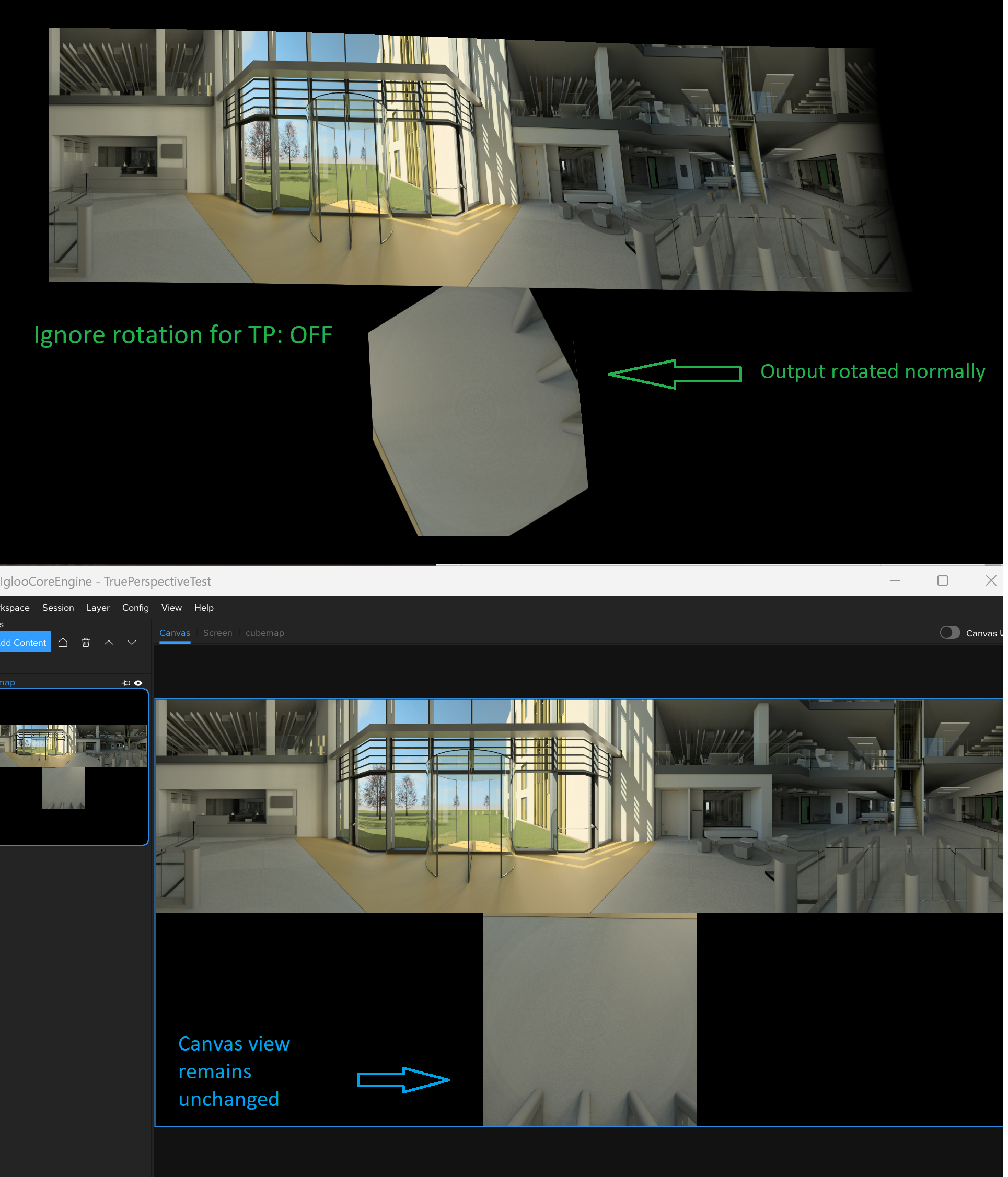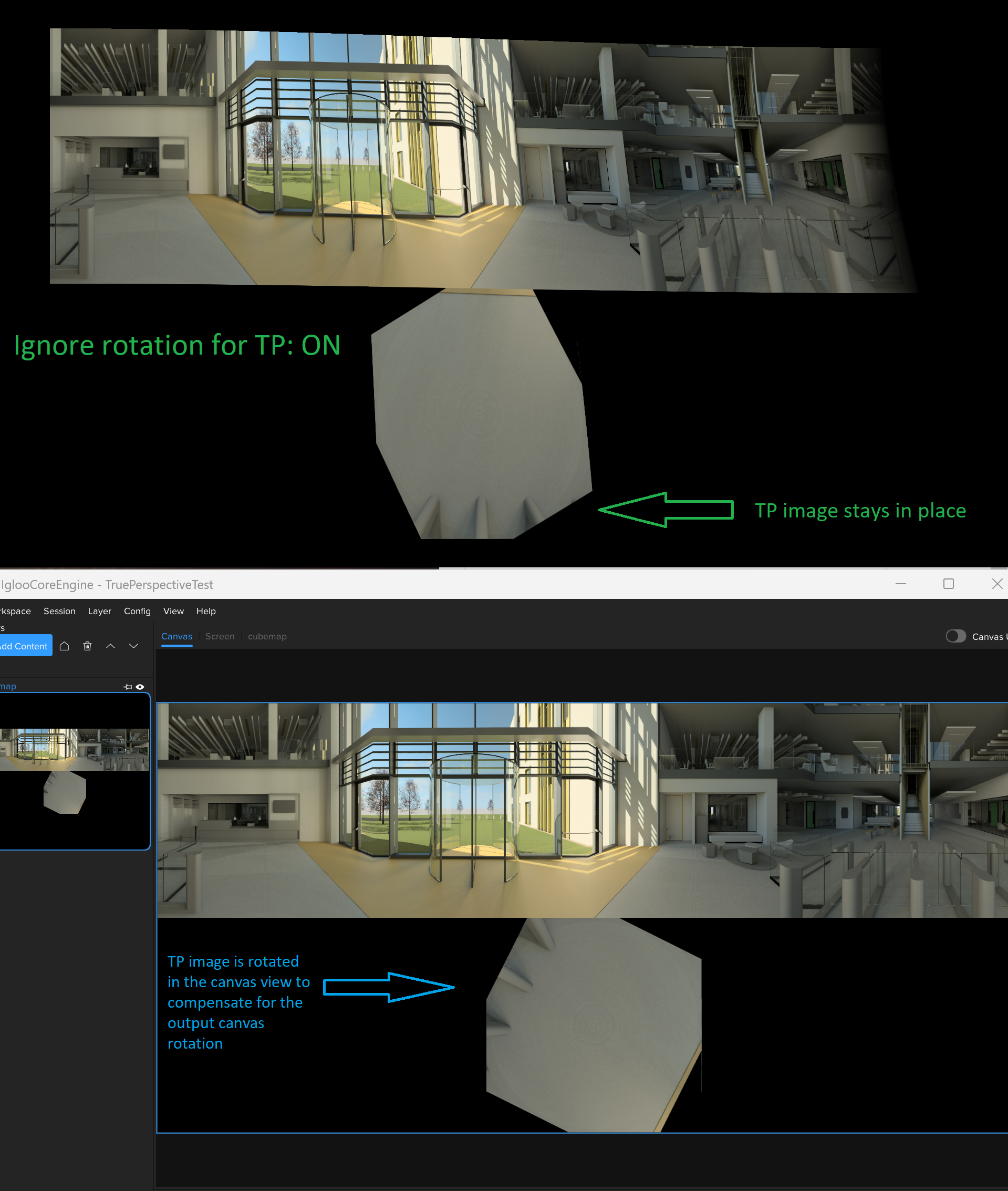 It is important to note that when "Ignore wall/floor rotation TP" is enabled, the TP layer texture will still be rotated in the console Canvas tab. However, what you see on the output is the compensation for the rotation being applied, which makes the TP layer appear stationary..