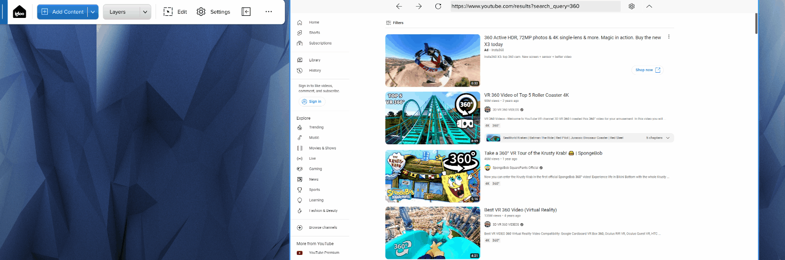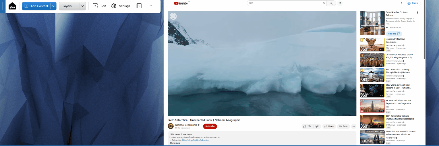 YouTube supports hosting of 360-degree movies. A special type of Igloo Core Engine layer can be used to view these movies across the whole Igloo canvas. This layer type can also be used to view non-360 and 3D movies. This tutorial shows how to find and display a YouTube 360 movie.