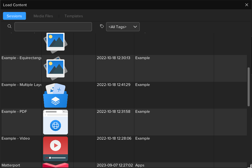 The Content library window lists all content items which have been added to the system. It provides a thumbnail preview alongside additional metadata such as name, resolution and other information, as appropriate.