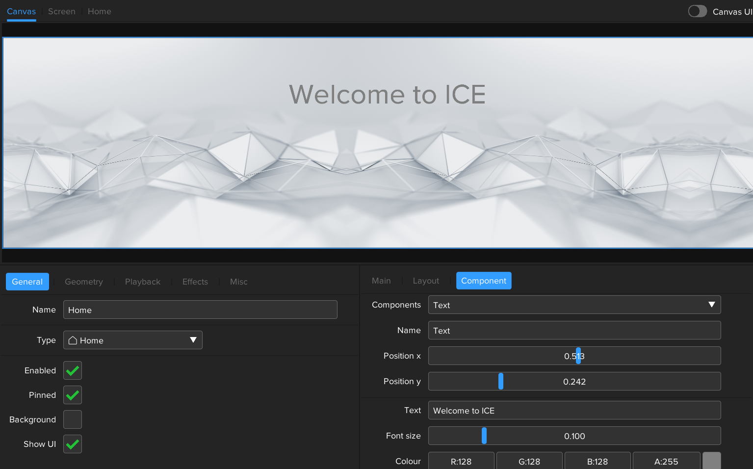 This will draw the word ‘text’ in the top left corner of the Home layer. Click on the Component tab and change the Text field to say ‘Welcome to Igloo Core Engine’. Use the X and Y position sliders to move the text into the upper centre of the Home layer.