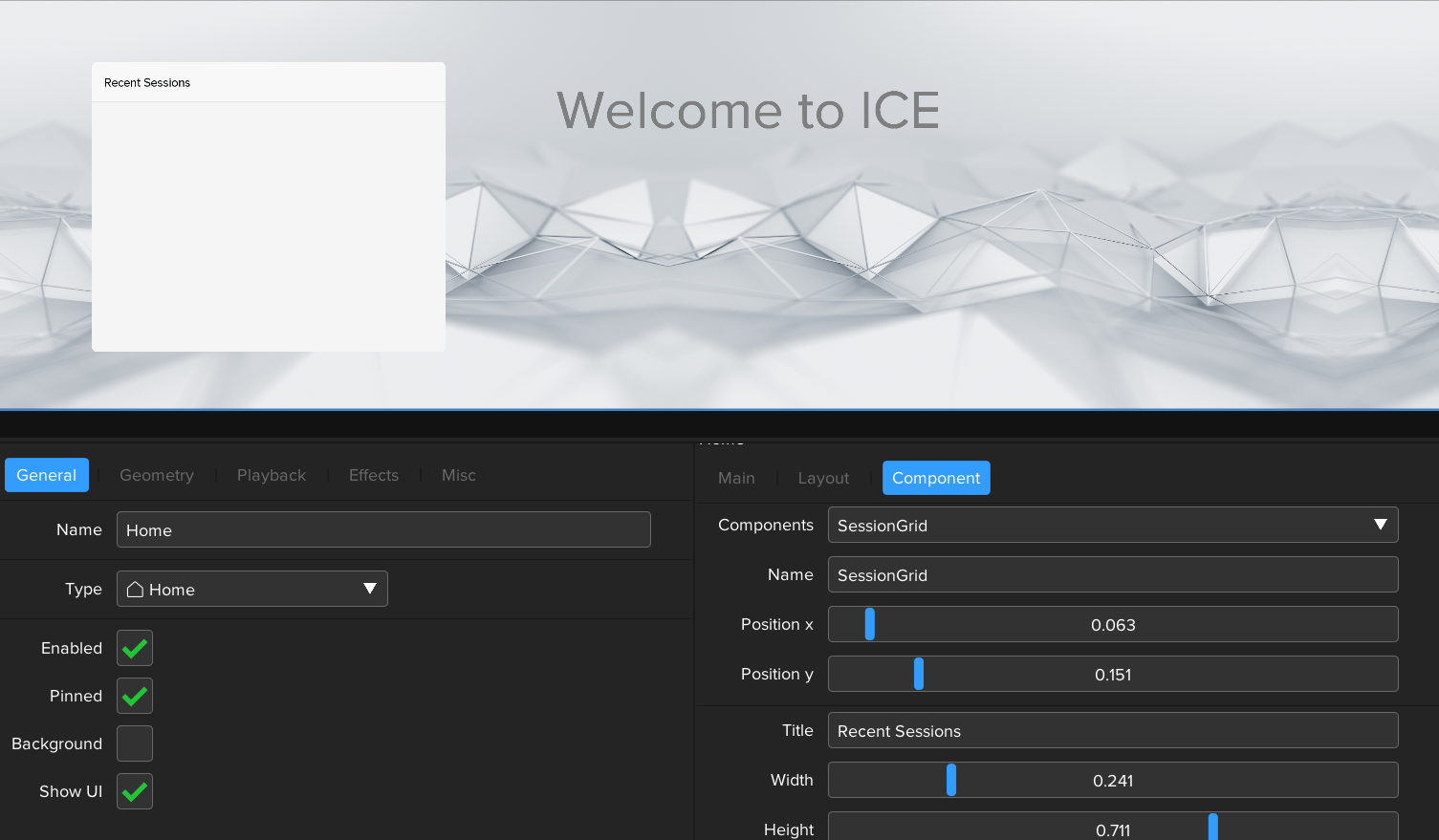 Return to the Layout tab and press the ‘+' button. Select Grid from the popup menu. On the Component tab, set the name to be SessionGrid and set the title to be 'Recent Sessions’. Use the position sliders and width, height sliders so that the grid appears to the left of the Welcome text.