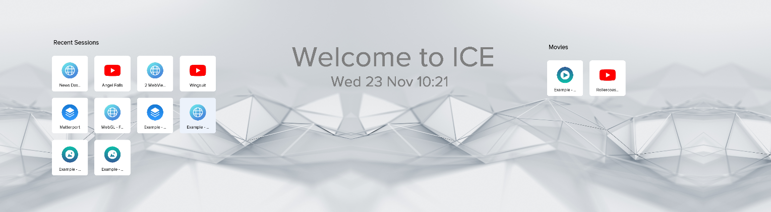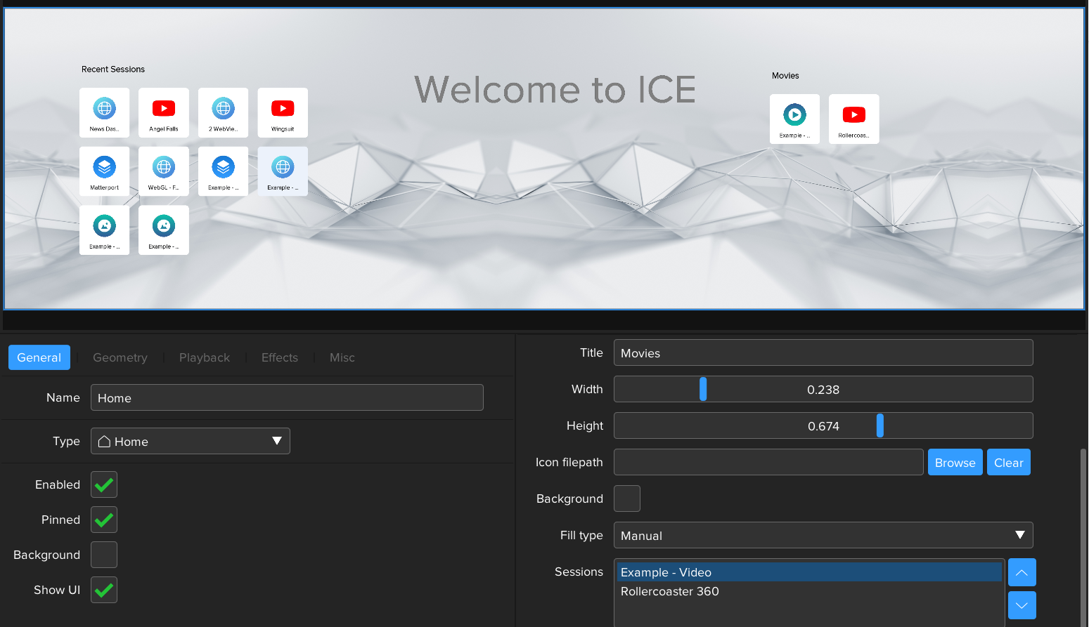 Select the Home layer and go to the Layout tab in the layer properties. Press the ‘+' button and select Grid. Set the grid name to MovieGrid and title to ‘Movies’. Scale and position the grid so it appears on the right side of the Homescreen. Leaving the Fill type as Manual, add a couple of sessions showing movies to the grid, e.g. use the 'Example - Video’ session and the Rollercoaster Youtube 360 movie. Notice how the icons on each tile correspond with the type of content in each session.