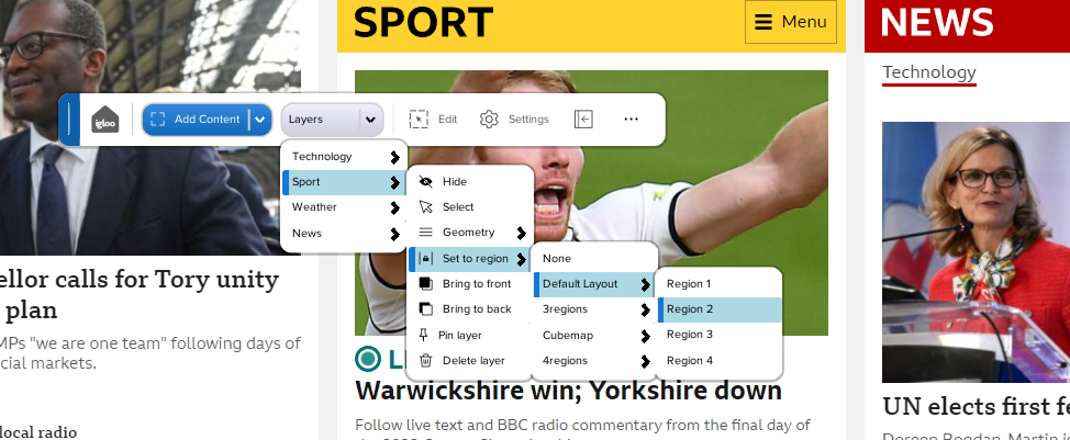 You can also use the mouse to interact with the Canvas toolbar. Select the Layers button and hide/show the WebView layers. Use the Set to region menu to swap the positions of the WebViews.