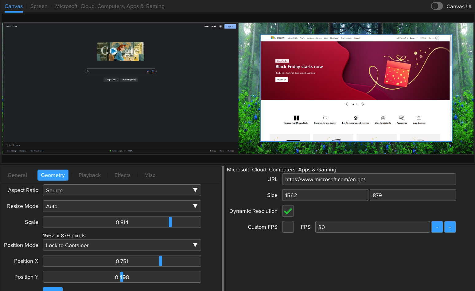 Next, let’s add another new WebView using the New > WebView menu option and change the URL to https://www.microsoft.com . Drag the WebView to the right side of the canvas. Also try scaling the WebView using the Scale slider in the Geometry tab of the layer properties.