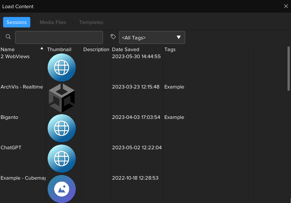 Once the WebViews are removed, press the Add Content button and select Load. The Load Content dialog will appear showing 3 tabs: Sessions, Media Files and Templates. Select the Sessions tab and then select the session you previously saved. This will load the WebViews back into the layer list and display them on the canvas.