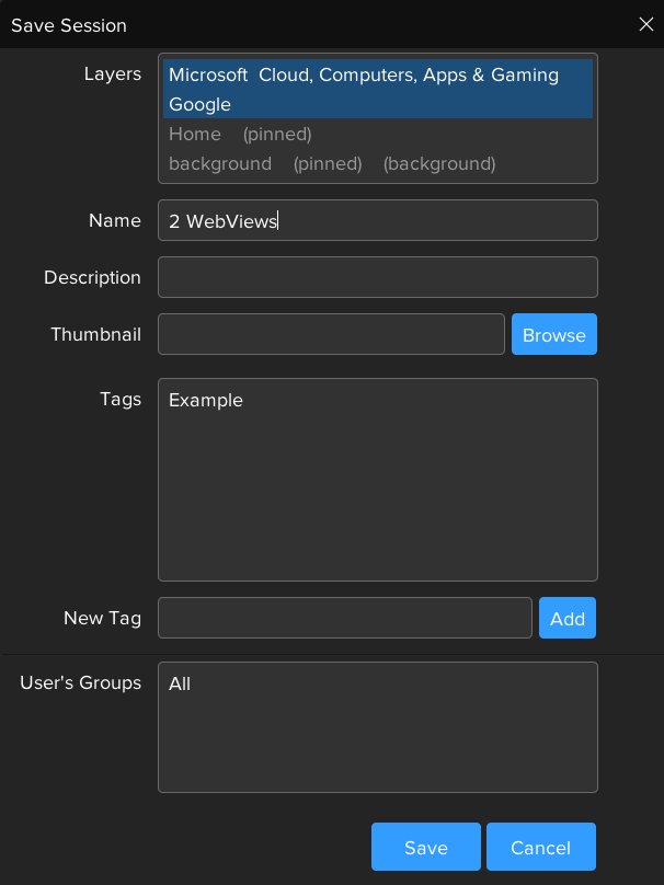 The Save Session dialog will popup and you can pick both of your WebViews by name in the list of layers shown at the top. Click each WebView name with the left mouse button. Next enter a name for the session, such as ‘2 WebViews’. Finally press Save to save the session to the database.