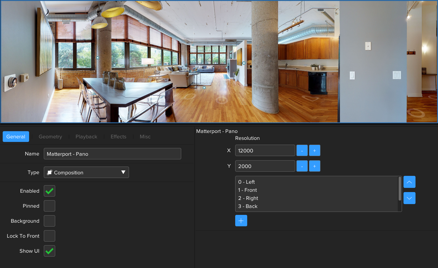 A 360 view of a Matterport space is provided using a Composition layer in Igloo Core Engine to build a cubemap. The cubemap is then displayed correctly in the immersive space using the TruePerspective effect.