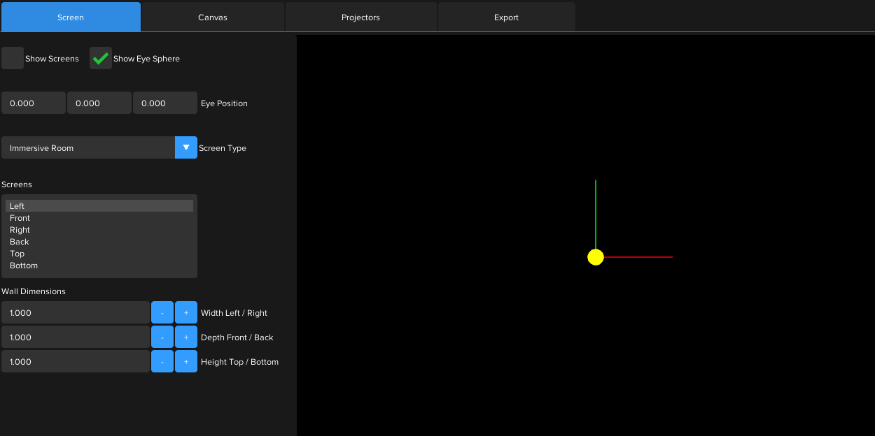 The user interface consists of tabs - Screen, Canvas, Projectors, Windows, Warping, Blending, Black Level (Optional) and Export, which are intended to be used sequentially. These represent the stages in the Igloo Setup pipeline. The workflow begins by defining the geometry of the Screen. The Canvas tab uses the screen dimensions to determine the pixel resolution of the space. Likewise, the Projectors tab uses the canvas to specify the projector regions and other attributes. The Windows tab determines the number and location of the output windows. The Warping and Blending tabs are used to alter the geometry and blending between projectors to create a seamless image. Finally, the configuration files are generated in the Export tab.