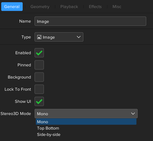 To specify the Stereo 3D setting for a particular layer, go to the General tab in the Layer Properties pane. In this tab, you can choose from various supported stereo formats including: