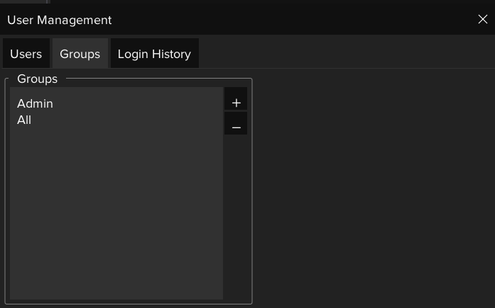 Groups: it shows the users saved in the database (left). As it is possible to see, we have +/- buttons besides the Groups list, + will open a window where to specify the new group name whereas - will open a window to ensure the user truly desire to delete the selected group.