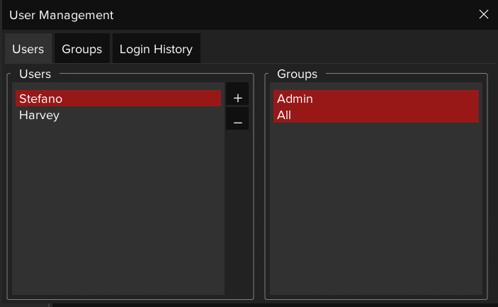 Users: it shows the users saved in the database (left) and, once a user is selected, the groups associated with it (right). As it is possible to see, we have +/- buttons besides the Users list, + will open a window where to specify the new user name whereas - will open a window to ensure the user truly desire to delete the selected user.
